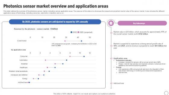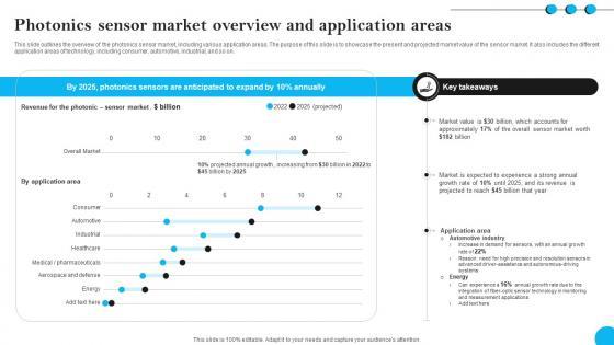 This slide outlines the overview of the photonics sensor market, including various application areas. The purpose of this slide is to showcase the present and projected market value of the sensor market. It also includes the different application areas of technology, including consumer, automotive, industrial, and so on. From laying roadmaps to briefing everything in detail, our templates are perfect for you. You can set the stage with your presentation slides. All you have to do is download these easy-to-edit and customizable templates. Fibers IT Photonics Sensor Market Overview And Application Areas will help you deliver an outstanding performance that everyone would remember and praise you for. Do download this presentation today. This slide outlines the overview of the photonics sensor market, including various application areas. The purpose of this slide is to showcase the present and projected market value of the sensor market. It also includes the different application areas of technology, including consumer, automotive, industrial, and so on.