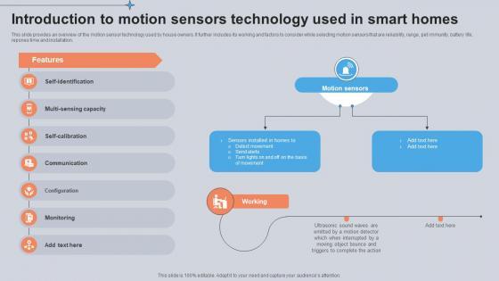 This slide provides an overview of the motion sensor technology used by house owners. It further includes its working and factors to consider while selecting motion sensors that are reliability, range, pet immunity, battery life, repones time and installation. Find a pre-designed and impeccable Introduction To Motion Sensors Technology Used In Smart Homes Utilizing Smart Appliances IoT SS V. The templates can ace your presentation without additional effort. You can download these easy-to-edit presentation templates to make your presentation stand out from others. So, what are you waiting for Download the template from Slidegeeks today and give a unique touch to your presentation. This slide provides an overview of the motion sensor technology used by house owners. It further includes its working and factors to consider while selecting motion sensors that are reliability, range, pet immunity, battery life, repones time and installation.