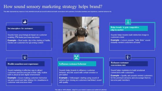 This slide represents key reasons of why marketers should use sound to attract and build connections with customers. It includes seamless user experience, customer behavior etc. Formulating a presentation can take up a lot of effort and time, so the content and message should always be the primary focus. The visuals of the PowerPoint can enhance the presenters message, so our Utilizing Neuromarketing Techniques How Sound Sensory Marketing Strategy Formats PDF was created to help save time. Instead of worrying about the design, the presenter can concentrate on the message while our designers work on creating the ideal templates for whatever situation is needed. Slidegeeks has experts for everything from amazing designs to valuable content, we have put everything into Utilizing Neuromarketing Techniques How Sound Sensory Marketing Strategy Formats PDF.
