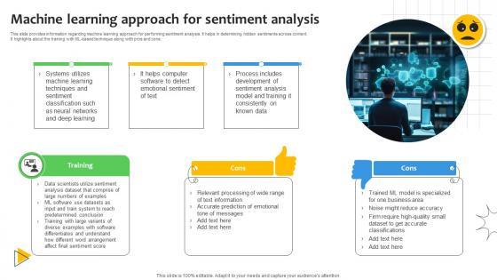 This slide provides information regarding machine learning approach for performing sentiment analysis. It helps in determining hidden sentiments across content. It highlights about the training with ML-based technique along with pros and cons. This Machine Learning Approach For Sentiment Analysis Demystified Understanding AI SS V from Slidegeeks makes it easy to present information on your topic with precision. It provides customization options, so you can make changes to the colors, design, graphics, or any other component to create a unique layout. It is also available for immediate download, so you can begin using it right away. Slidegeeks has done good research to ensure that you have everything you need to make your presentation stand out. Make a name out there for a brilliant performance. This slide provides information regarding machine learning approach for performing sentiment analysis. It helps in determining hidden sentiments across content. It highlights about the training with ML-based technique along with pros and cons.