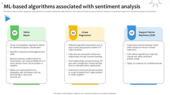 This slide provides information regarding ML-based algorithms for sentiment analysis that enable machines to learn patterns from data and make predictions or decisions. It includes Naive Bayes, linear regression and support vector machines. Do you know about Slidesgeeks ML Based Algorithms Associated With Sentiment Analysis Demystified Understanding AI SS V These are perfect for delivering any kind od presentation. Using it, create PowerPoint presentations that communicate your ideas and engage audiences. Save time and effort by using our pre-designed presentation templates that are perfect for a wide range of topic. Our vast selection of designs covers a range of styles, from creative to business, and are all highly customizable and easy to edit. Download as a PowerPoint template or use them as Google Slides themes. This slide provides information regarding ML-based algorithms for sentiment analysis that enable machines to learn patterns from data and make predictions or decisions. It includes Naive Bayes, linear regression and support vector machines.