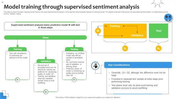 This slide provides information regarding model training with supervised sentiment analysis in which algorithm requires labeled dataset for training purpose. The dataset comprises of text paired with associated sentiment labels. It includes steps such as training, validation, testing. Find a pre-designed and impeccable Model Training Through Supervised Sentiment Analysis Demystified Understanding AI SS V. The templates can ace your presentation without additional effort. You can download these easy-to-edit presentation templates to make your presentation stand out from others. So, what are you waiting for Download the template from Slidegeeks today and give a unique touch to your presentation. This slide provides information regarding model training with supervised sentiment analysis in which algorithm requires labeled dataset for training purpose. The dataset comprises of text paired with associated sentiment labels. It includes steps such as training, validation, testing.
