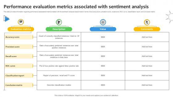This slide provides information regarding performance assessment metrics related with the sentiment analysis-based model in terms of accuracy score, precision score, recall score, ROC curve, classification report, and conclusion matrix. Create an editable Performance Evaluation Metrics Associated Sentiment Analysis Demystified Understanding AI SS V that communicates your idea and engages your audience. Whether you are presenting a business or an educational presentation, pre-designed presentation templates help save time. Performance Evaluation Metrics Associated Sentiment Analysis Demystified Understanding AI SS V is highly customizable and very easy to edit, covering many different styles from creative to business presentations. Slidegeeks has creative team members who have crafted amazing templates. So, go and get them without any delay. This slide provides information regarding performance assessment metrics related with the sentiment analysis-based model in terms of accuracy score, precision score, recall score, ROC curve, classification report, and conclusion matrix.