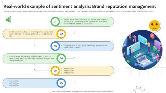 This slide provides information regarding the popular application of sentiment analysis in managing brand reputation. It helps in assessing the sentiments opinions of users related to product performance and helps in extracting relevant insights. Slidegeeks is one of the best resources for PowerPoint templates. You can download easily and regulate Real World Example Of Sentiment Analysis Brand Sentiment Analysis Demystified Understanding AI SS V for your personal presentations from our wonderful collection. A few clicks is all it takes to discover and get the most relevant and appropriate templates. Use our Templates to add a unique zing and appeal to your presentation and meetings. All the slides are easy to edit and you can use them even for advertisement purposes. This slide provides information regarding the popular application of sentiment analysis in managing brand reputation. It helps in assessing the sentiments opinions of users related to product performance and helps in extracting relevant insights.