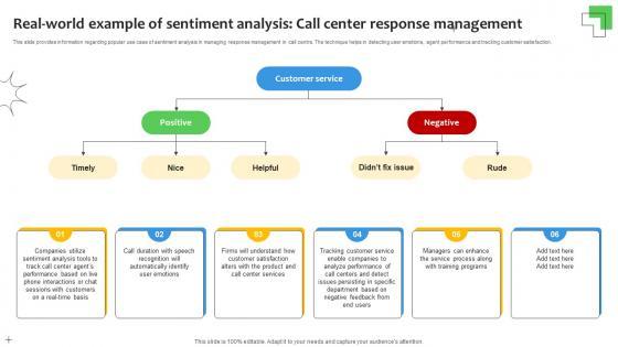 This slide provides information regarding popular use case of sentiment analysis in managing response management in call centre. The technique helps in detecting user emotions, agent performance and tracking customer satisfaction. Want to ace your presentation in front of a live audience Our Real World Example Of Sentiment Analysis Call Sentiment Analysis Demystified Understanding AI SS V can help you do that by engaging all the users towards you. Slidegeeks experts have put their efforts and expertise into creating these impeccable powerpoint presentations so that you can communicate your ideas clearly. Moreover, all the templates are customizable, and easy-to-edit and downloadable. Use these for both personal and commercial use. This slide provides information regarding popular use case of sentiment analysis in managing response management in call centre. The technique helps in detecting user emotions, agent performance and tracking customer satisfaction.