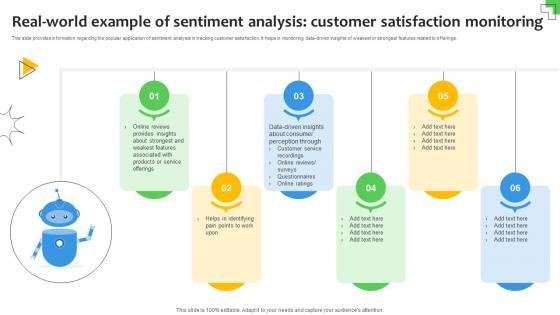 This slide provides information regarding real-world use case of sentiment analysis in terms of insights generation and decision making. Use case highlights how positive, negative or neutral sentiment are detected. Do you have to make sure that everyone on your team knows about any specific topic I yes, then you should give Real World Example Of Sentiment Analysis Generating Sentiment Analysis Demystified Understanding AI SS V a try. Our experts have put a lot of knowledge and effort into creating this impeccable Real World Example Of Sentiment Analysis Generating Sentiment Analysis Demystified Understanding AI SS V. You can use this template for your upcoming presentations, as the slides are perfect to represent even the tiniest detail. You can download these templates from the Slidegeeks website and these are easy to edit. So grab these today This slide provides information regarding real-world use case of sentiment analysis in terms of insights generation and decision making. Use case highlights how positive, negative or neutral sentiment are detected.