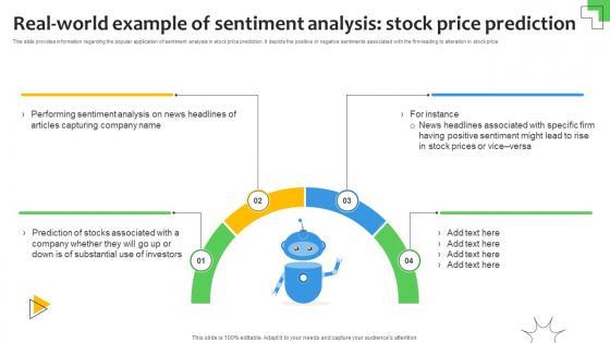 This slide provides information regarding the popular application of sentiment analysis in stock price prediction. It depicts the positive or negative sentiments associated with the firm leading to alteration in stock price. Get a simple yet stunning designed Real World Example Of Sentiment Analysis Stock Sentiment Analysis Demystified Understanding AI SS V. It is the best one to establish the tone in your meetings. It is an excellent way to make your presentations highly effective. So, download this PPT today from Slidegeeks and see the positive impacts. Our easy-to-edit Real World Example Of Sentiment Analysis Stock Sentiment Analysis Demystified Understanding AI SS V can be your go-to option for all upcoming conferences and meetings. So, what are you waiting for Grab this template today. This slide provides information regarding the popular application of sentiment analysis in stock price prediction. It depicts the positive or negative sentiments associated with the firm leading to alteration in stock price.