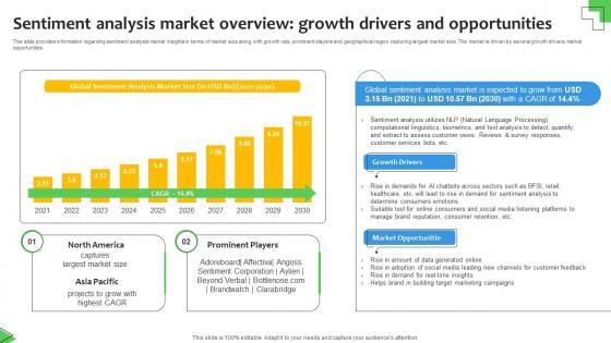 This slide provides information regarding sentiment analysis market insights in terms of market size along with growth rate, prominent players and geographical region capturing largest market size. The market is driven by several growth drivers, market opportunities. Do you have an important presentation coming up Are you looking for something that will make your presentation stand out from the rest Look no further than Sentiment Analysis Market Overview Growth Sentiment Analysis Demystified Understanding AI SS V. With our professional designs, you can trust that your presentation will pop and make delivering it a smooth process. And with Slidegeeks, you can trust that your presentation will be unique and memorable. So why wait Grab Sentiment Analysis Market Overview Growth Sentiment Analysis Demystified Understanding AI SS V today and make your presentation stand out from the rest This slide provides information regarding sentiment analysis market insights in terms of market size along with growth rate, prominent players and geographical region capturing largest market size. The market is driven by several growth drivers, market opportunities.