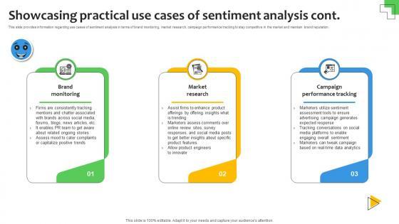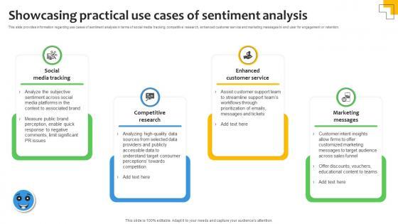 This slide provides information regarding use cases of sentiment analysis in terms of social media tracking, competitive research, enhanced customer service and marketing messages to end user for engagement or retention. If your project calls for a presentation, then Slidegeeks is your go-to partner because we have professionally designed, easy-to-edit templates that are perfect for any presentation. After downloading, you can easily edit Showcasing Practical Use Cases Of Sentiment Analysis Demystified Understanding AI SS V and make the changes accordingly. You can rearrange slides or fill them with different images. Check out all the handy templates This slide provides information regarding use cases of sentiment analysis in terms of social media tracking, competitive research, enhanced customer service and marketing messages to end user for engagement or retention.