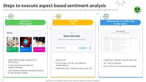 This slide provides information regarding various steps required to process aspect-based sentiment analysis in terms of selection of NPS template, uploading data and matching data to suitable field in each column. If you are looking for a format to display your unique thoughts, then the professionally designed Steps To Execute Aspect Based Sentiment Analysis Demystified Understanding AI SS V is the one for you. You can use it as a Google Slides template or a PowerPoint template. Incorporate impressive visuals, symbols, images, and other charts. Modify or reorganize the text boxes as you desire. Experiment with shade schemes and font pairings. Alter, share or cooperate with other people on your work. Download Steps To Execute Aspect Based Sentiment Analysis Demystified Understanding AI SS V and find out how to give a successful presentation. Present a perfect display to your team and make your presentation unforgettable. This slide provides information regarding various steps required to process aspect-based sentiment analysis in terms of selection of NPS template, uploading data and matching data to suitable field in each column.