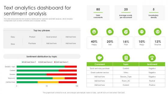This slide showcases the text analytics dashboard for customer sentiment analysis, which includes components such as total comments and vocabulary density. Here you can discover an assortment of the finest PowerPoint and Google Slides templates. With these templates, you can create presentations for a variety of purposes while simultaneously providing your audience with an eye-catching visual experience. Download Text Analytics Dashboard For Sentiment Analysis PPT Template SS to deliver an impeccable presentation. These templates will make your job of preparing presentations much quicker, yet still, maintain a high level of quality. Slidegeeks has experienced researchers who prepare these templates and write high-quality content for you. Later on, you can personalize the content by editing the Text Analytics Dashboard For Sentiment Analysis PPT Template SS. This slide showcases the text analytics dashboard for customer sentiment analysis, which includes components such as total comments and vocabulary density.