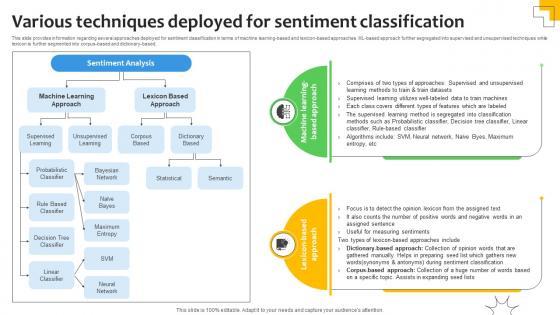 This slide provides information regarding several approaches deployed for sentiment classification in terms of machine learning-based and lexicon-based approaches. ML-based approach further segregated into supervised and unsupervised techniques while lexicon is further segmented into corpus-based and dictionary-based. This modern and well-arranged Various Techniques Deployed For Sentiment Analysis Demystified Understanding AI SS V provides lots of creative possibilities. It is very simple to customize and edit with the Powerpoint Software. Just drag and drop your pictures into the shapes. All facets of this template can be edited with Powerpoint, no extra software is necessary. Add your own material, put your images in the places assigned for them, adjust the colors, and then you can show your slides to the world, with an animated slide included. This slide provides information regarding several approaches deployed for sentiment classification in terms of machine learning-based and lexicon-based approaches. ML-based approach further segregated into supervised and unsupervised techniques while lexicon is further segmented into corpus-based and dictionary-based.