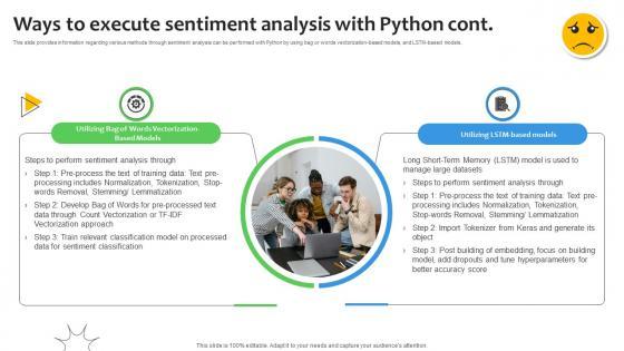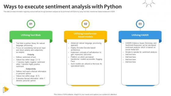 This slide provides information regarding various methods through sentiment analysis can be performed with Python by using Text blob, transformer-based models and VADER. This Ways To Execute Sentiment Analysis With Sentiment Analysis Demystified Understanding AI SS V is perfect for any presentation, be it in front of clients or colleagues. It is a versatile and stylish solution for organizing your meetings. The Ways To Execute Sentiment Analysis With Sentiment Analysis Demystified Understanding AI SS V features a modern design for your presentation meetings. The adjustable and customizable slides provide unlimited possibilities for acing up your presentation. Slidegeeks has done all the homework before launching the product for you. So, do not wait, grab the presentation templates today This slide provides information regarding various methods through sentiment analysis can be performed with Python by using Text blob, transformer-based models and VADER.