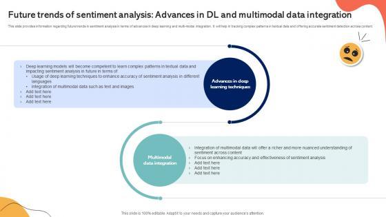 This slide provides information regarding future trends in sentiment analysis in terms of advances in deep learning and multi-modal integration. It will help in tracking complex patterns in textual data and offering accurate sentiment detection across content. Welcome to our selection of the Future Trends Of Sentiment Analysis Advances In Dl Emotionally Intelligent Insights Leveraging AI SS V. These are designed to help you showcase your creativity and bring your sphere to life. Planning and Innovation are essential for any business that is just starting out. This collection contains the designs that you need for your everyday presentations. All of our PowerPoints are 100 percent editable, so you can customize them to suit your needs. This multi-purpose template can be used in various situations. Grab these presentation templates today. This slide provides information regarding future trends in sentiment analysis in terms of advances in deep learning and multi-modal integration. It will help in tracking complex patterns in textual data and offering accurate sentiment detection across content.
