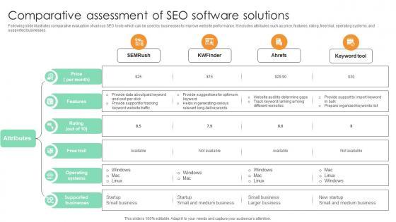 Following slide illustrates comparative evaluation of various SEO tools which can be used by businesses to improve website performance. It includes attributes such as price, features, rating, free trial, operating systems, and supported businesses.Formulating a presentation can take up a lot of effort and time, so the content and message should always be the primary focus. The visuals of the PowerPoint can enhance the presenters message, so our Comparative Assessment Of Seo Software Solutions Comprehensive Guide For Marketing Technology was created to help save time. Instead of worrying about the design, the presenter can concentrate on the message while our designers work on creating the ideal templates for whatever situation is needed. Slidegeeks has experts for everything from amazing designs to valuable content, we have put everything into Comparative Assessment Of Seo Software Solutions Comprehensive Guide For Marketing Technology. Following slide illustrates comparative evaluation of various SEO tools which can be used by businesses to improve website performance. It includes attributes such as price, features, rating, free trial, operating systems, and supported businesses.