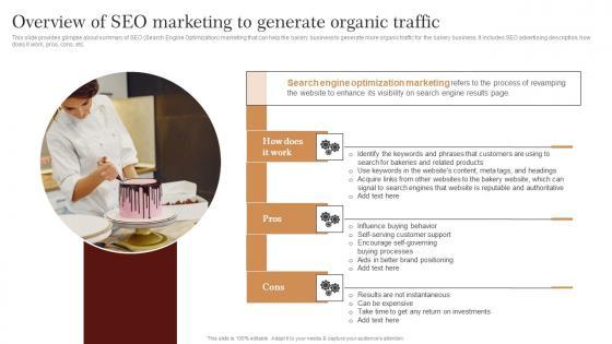 This slide provides glimpse about summary of SEO Search Engine Optimization marketing that can help the bakery business to generate more organic traffic for the bakery business. It includes SEO advertising description, how does it work, pros, cons, etc.Explore a selection of the finest Overview Of Seo Marketing To Generate Organic Strategic Advertising Plan For Bakehouse Background Pdf here. With a plethora of professionally designed and pre made slide templates, you can quickly and easily find the right one for your upcoming presentation. You can use our Overview Of Seo Marketing To Generate Organic Strategic Advertising Plan For Bakehouse Background Pdf to effectively convey your message to a wider audience. Slidegeeks has done a lot of research before preparing these presentation templates. The content can be personalized and the slides are highly editable. Grab templates today from Slidegeeks. This slide provides glimpse about summary of SEO Search Engine Optimization marketing that can help the bakery business to generate more organic traffic for the bakery business. It includes SEO advertising description, how does it work, pros, cons, etc.