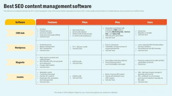 This slide shows comparison between top SEO content management tools which can be used by organizations to improve SEO content quality and performance. It includes features, price, pros and cons of different tools. Slidegeeks is one of the best resources for PowerPoint templates. You can download easily and regulate Best Seo Content Management Software Seo Content Plan To Drive Strategy SS V for your personal presentations from our wonderful collection. A few clicks is all it takes to discover and get the most relevant and appropriate templates. Use our Templates to add a unique zing and appeal to your presentation and meetings. All the slides are easy to edit and you can use them even for advertisement purposes. This slide shows comparison between top SEO content management tools which can be used by organizations to improve SEO content quality and performance. It includes features, price, pros and cons of different tools.