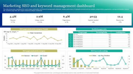 This slide showcases a dashboard for search engine optimization and keyword management to effectively analyze performance. It highlights element such as sessions, unique visitors, page visitors, average visit duration, bounce rate, backlinks page ratio, SEO pages analysis by category and trends. Coming up with a presentation necessitates that the majority of the effort goes into the content and the message you intend to convey. The visuals of a PowerPoint presentation can only be effective if it supplements and supports the story that is being told. Keeping this in mind our experts created Strategic Promotion Plan Development Stages Marketing SEO And Keyword Management Dashboard Pictures PDF to reduce the time that goes into designing the presentation. This way, you can concentrate on the message while our designers take care of providing you with the right template for the situation.