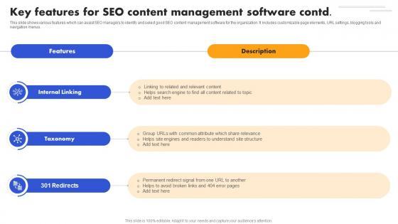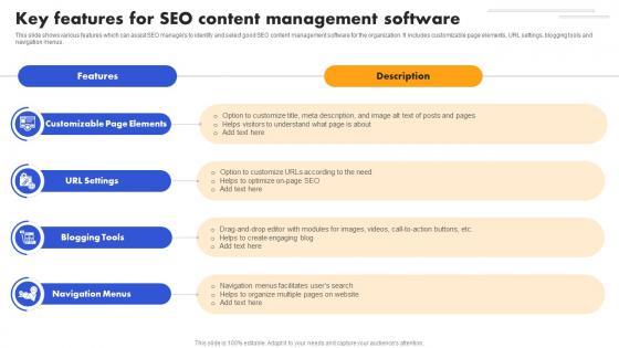 This slide shows various features which can assist SEO managers to identify and select good SEO content management software for the organization. It includes customizable page elements, URL settings, blogging tools and navigation menus. Make sure to capture your audiences attention in your business displays with our gratis customizable Key Features For Seo Content Management Software Seo Content Plan To Drive Strategy SS V These are great for business strategies, office conferences, capital raising or task suggestions. If you desire to acquire more customers for your tech business and ensure they stay satisfied, create your own sales presentation with these plain slides. This slide shows various features which can assist SEO managers to identify and select good SEO content management software for the organization. It includes customizable page elements, URL settings, blogging tools and navigation menus.
