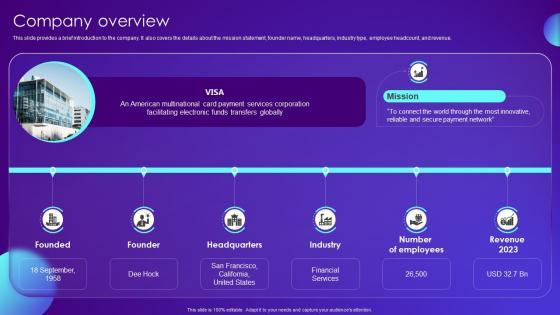 This slide provides a brief introduction to the company. It also covers the details about the mission statement, founder name, headquarters, industry type, employee headcount, and revenue. Are you searching for a Company Overview Payment Card Services Business Model BMC SS V that is uncluttered, straightforward, and original Its easy to edit, and you can change the colors to suit your personal or business branding. For a presentation that expresses how much effort you have put in, this template is ideal With all of its features, including tables, diagrams, statistics, and lists, its perfect for a business plan presentation. Make your ideas more appealing with these professional slides. Download Company Overview Payment Card Services Business Model BMC SS V from Slidegeeks today. This slide provides a brief introduction to the company. It also covers the details about the mission statement, founder name, headquarters, industry type, employee headcount, and revenue.