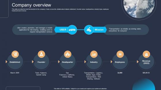 This slide showcases the overview of a multinational technology conglomerate. It further includes founder, headquarters, industry, employees and revenue. Create an editable Company Overview Security Service Provider Business Model BMC SS V that communicates your idea and engages your audience. Whether you are presenting a business or an educational presentation, pre-designed presentation templates help save time. Company Overview Security Service Provider Business Model BMC SS V is highly customizable and very easy to edit, covering many different styles from creative to business presentations. Slidegeeks has creative team members who have crafted amazing templates. So, go and get them without any delay. This slide showcases the overview of a multinational technology conglomerate. It further includes founder, headquarters, industry, employees and revenue.