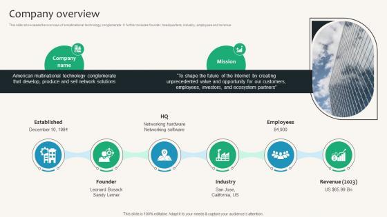 This slide showcases the overview of a multinational technology conglomerate. It further includes founder, headquarters, industry, employees and revenue. Create an editable Company Overview Cloud Networking Service Provider Business Model BMC SS V that communicates your idea and engages your audience. Whether you are presenting a business or an educational presentation, pre-designed presentation templates help save time. Company Overview Cloud Networking Service Provider Business Model BMC SS V is highly customizable and very easy to edit, covering many different styles from creative to business presentations. Slidegeeks has creative team members who have crafted amazing templates. So, go and get them without any delay. This slide showcases the overview of a multinational technology conglomerate. It further includes founder, headquarters, industry, employees and revenue.
