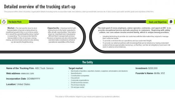 The purpose of the slide is to portray organization details including name, incorporation date, web address, start up investment, services etc. It also covers quick pitch and the goals and objectives of the firm. From laying roadmaps to briefing everything in detail, our templates are perfect for you. You can set the stage with your presentation slides. All you have to do is download these easy-to-edit and customizable templates. Detailed Overview Of The Trucking Start Up Trucking Services Business Plan Themes Pdf will help you deliver an outstanding performance that everyone would remember and praise you for. Do download this presentation today. The purpose of the slide is to portray organization details including name, incorporation date, web address, start up investment, services etc. It also covers quick pitch and the goals and objectives of the firm.