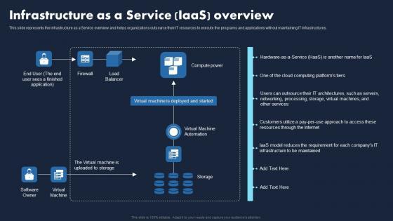 This slide represents the infrastructure as a Service overview and helps organizations outsource their IT resources to execute the programs and applications without maintaining IT infrastructures. From laying roadmaps to briefing everything in detail, our templates are perfect for you. You can set the stage with your presentation slides. All you have to do is download these easy to edit and customizable templates. Infrastructure As A Service IaaS Overview Transforming Business With IaaS Elements Pdf will help you deliver an outstanding performance that everyone would remember and praise you for. Do download this presentation today. This slide represents the infrastructure as a Service overview and helps organizations outsource their IT resources to execute the programs and applications without maintaining IT infrastructures.