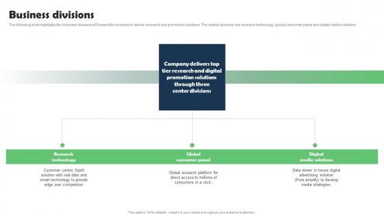 The following slide highlights the business divisions of Pureprofile company to deliver research and promotion solutions. The central divisions are research technology, global consumer panel and digital media solutions. Slidegeeks is one of the best resources for PowerPoint templates. You can download easily and regulate Business Divisions Marketing Research Services Management Business Diagrams Pdf for your personal presentations from our wonderful collection. A few clicks is all it takes to discover and get the most relevant and appropriate templates. Use our Templates to add a unique zing and appeal to your presentation and meetings. All the slides are easy to edit and you can use them even for advertisement purposes. The following slide highlights the business divisions of Pureprofile company to deliver research and promotion solutions. The central divisions are research technology, global consumer panel and digital media solutions.