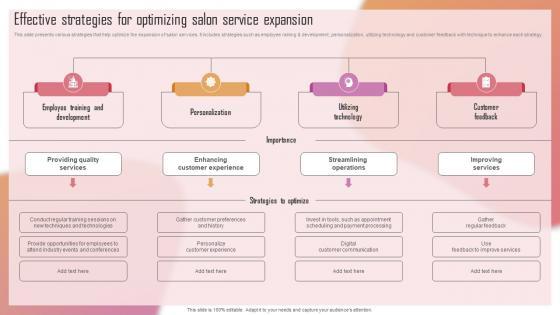 This slide presents various strategies that help optimize the expansion of salon services. It includes strategies such as employee raining and development, personalization, utilizing technology and customer feedback with technique to enhance each strategy. Make sure to capture your audiences attention in your business displays with our gratis customizable Customizing The Salon Experience Effective Strategies For Optimizing Salon Service Expansion Strategy SS V. These are great for business strategies, office conferences, capital raising or task suggestions. If you desire to acquire more customers for your tech business and ensure they stay satisfied, create your own sales presentation with these plain slides. This slide presents various strategies that help optimize the expansion of salon services. It includes strategies such as employee raining and development, personalization, utilizing technology and customer feedback with technique to enhance each strategy.