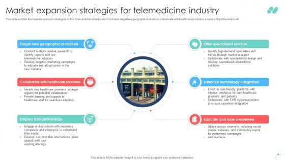 This slide exhibits the market expansion strategies for the Telemedicine industry which includes target new geographical markets, collaborate with healthcare providers, employ b2b partnerships, etc. Coming up with a presentation necessitates that the majority of the effort goes into the content and the message you intend to convey. The visuals of a PowerPoint presentation can only be effective if it supplements and supports the story that is being told. Keeping this in mind our experts created Market Expansion Strategies For Telemedicine Industry Remote Healthcare Services IR SS V to reduce the time that goes into designing the presentation. This way, you can concentrate on the message while our designers take care of providing you with the right template for the situation. This slide exhibits the market expansion strategies for the Telemedicine industry which includes target new geographical markets, collaborate with healthcare providers, employ b2b partnerships, etc.