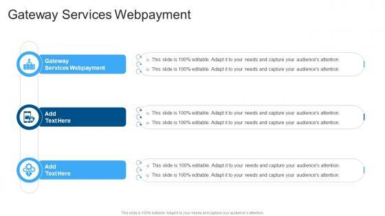 Introducing our well-designed Gateway Services Webpayment In Powerpoint And Google Slides Cpb. This PowerPoint design presents information on topics like Gateway Services Webpayment. As it is predesigned it helps boost your confidence level. It also makes you a better presenter because of its high-quality content and graphics. This PPT layout can be downloaded and used in different formats like PDF, PNG, and JPG. Not only this, it is available in both Standard Screen and Widescreen aspect ratios for your convenience. Therefore, click on the download button now to persuade and impress your audience. Our Gateway Services Webpayment In Powerpoint And Google Slides Cpb are topically designed to provide an attractive backdrop to any subject. Use them to look like a presentation pro.
