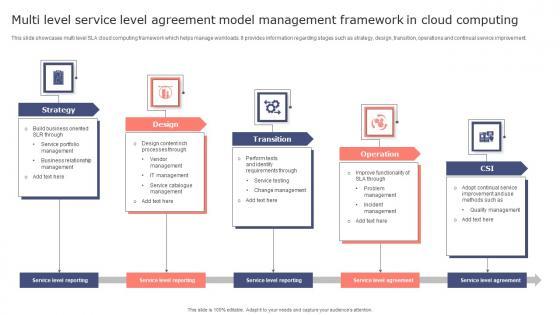 This slide showcases multi level SLA cloud computing framework which helps manage workloads. It provides information regarding stages such as strategy, design, transition, operations and continual service improvement. Pitch your topic with ease and precision using this Multi Level Service Level Agreement Model Management Framework In Cloud Computing Introduction Pdf. This layout presents information on Strategy, Design, Transition. It is also available for immediate download and adjustment. So, changes can be made in the color, design, graphics or any other component to create a unique layout. This slide showcases multi level SLA cloud computing framework which helps manage workloads. It provides information regarding stages such as strategy, design, transition, operations and continual service improvement.
