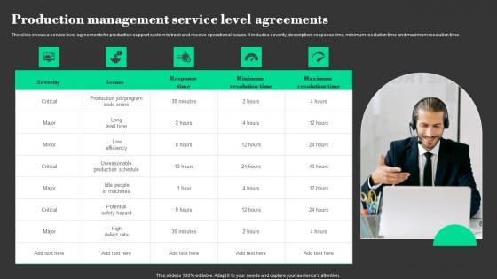 The slide shows a service level agreements for production support system to track and resolve operational issues. It includes severity, description, response time, minimum resolution time and maximum resolution time. Showcasing this set of slides titled Production Management Service Level Agreements Microsoft Pdf The topics addressed in these templates are Severity, Minimum Resolution, Maximum Resolution All the content presented in this PPT design is completely editable. Download it and make adjustments in color, background, font etc. as per your unique business setting. The slide shows a service level agreements for production support system to track and resolve operational issues. It includes severity, description, response time, minimum resolution time and maximum resolution time.
