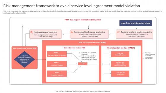 This slide showcases risk management framework which helps to mitigate SLA violation risk due to excess resource usage. It provides information regarding quality of service prediction module, runtime quality of service monitoring and threshold formation module. Showcasing this set of slides titled Risk Management Framework To Avoid Service Level Agreement Model Violation Clipart Pdf. The topics addressed in these templates are Service Prediction, Runtime Quality, Pre Interaction Phase. All the content presented in this PPT design is completely editable. Download it and make adjustments in color, background, font etc. as per your unique business setting. This slide showcases risk management framework which helps to mitigate SLA violation risk due to excess resource usage. It provides information regarding quality of service prediction module, runtime quality of service monitoring and threshold formation module.