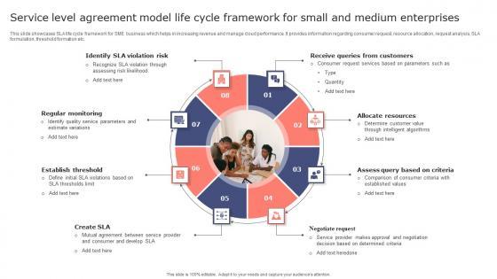 This slide showcases SLA life cycle framework for SME business which helps in increasing revenue and manage cloud performance. It provides information regarding consumer request, resource allocation, request analysis, SLA formulation, threshold formation etc. Showcasing this set of slides titled Service Level Agreement Model Life Cycle Framework For Small And Medium Enterprises Summary Pdf. The topics addressed in these templates are Regular Monitoring, Establish Threshold, Allocate Resources. All the content presented in this PPT design is completely editable. Download it and make adjustments in color, background, font etc. as per your unique business setting. This slide showcases SLA life cycle framework for SME business which helps in increasing revenue and manage cloud performance. It provides information regarding consumer request, resource allocation, request analysis, SLA formulation, threshold formation etc.