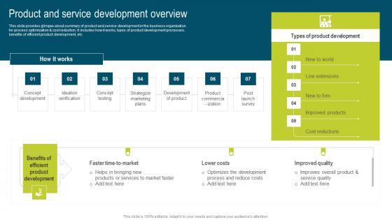 This slide provides glimpse about summary of product and service development in the business organization for process optimization and cost reduction. It includes how it works, types of product development processes, benefits of efficient product development, etc. Boost your pitch with our creative Product And Service Development Overview Developing Extensive Plan For Operational Template Pdf. Deliver an awe-inspiring pitch that will mesmerize everyone. Using these presentation templates you will surely catch everyones attention. You can browse the ppts collection on our website. We have researchers who are experts at creating the right content for the templates. So you do not have to invest time in any additional work. Just grab the template now and use them. This slide provides glimpse about summary of product and service development in the business organization for process optimization and cost reduction. It includes how it works, types of product development processes, benefits of efficient product development, etc.