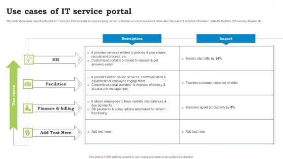 This slide showcases uses of self portal in IT services. This template focuses on giving current customers access to services and information they need. It includes information related to facilities, HR services, finance, etc. Showcasing this set of slides titled Use Cases Of IT Service Portal Portrait Pdf. The topics addressed in these templates are Facilities, Finance and billing, Description. All the content presented in this PPT design is completely editable. Download it and make adjustments in color, background, font etc. as per your unique business setting. This slide showcases uses of self portal in IT services. This template focuses on giving current customers access to services and information they need. It includes information related to facilities, HR services, finance, etc.