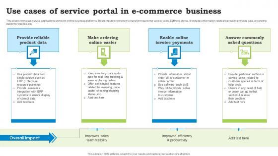 This slide showcases service applications proved in online business platforms. This template shows how to transform customer care by using B2B web stores. It includes information related to providing reliable data, answering customer queries, etc. Pitch your topic with ease and precision using this Use Cases Of Service Portal In E Commerce Business Graphics Pdf. This layout presents information on Provide reliable product data, Make ordering online easier, Enable online. It is also available for immediate download and adjustment. So, changes can be made in the color, design, graphics or any other component to create a unique layout. This slide showcases service applications proved in online business platforms. This template shows how to transform customer care by using B2B web stores. It includes information related to providing reliable data, answering customer queries, etc.