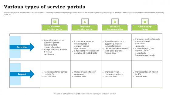 This slide showcases different approaches to self-services. This template focuses on providing instant issue resolution without any barriers of time and place. It includes information related to technical documentation, community forum, etc. Showcasing this set of slides titled Various Types Of Service Portals Graphics Pdf. The topics addressed in these templates are Customer service portal, Employee service portal, Technical documentation. All the content presented in this PPT design is completely editable. Download it and make adjustments in color, background, font etc. as per your unique business setting. This slide showcases different approaches to self-services. This template focuses on providing instant issue resolution without any barriers of time and place. It includes information related to technical documentation, community forum, etc.