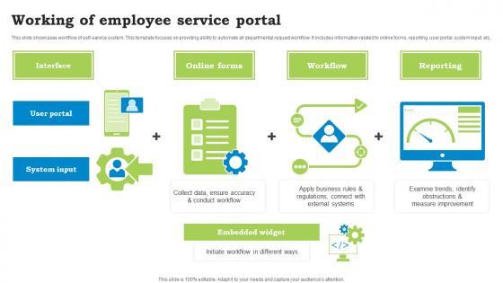 This slide showcases workflow of self-service system. This template focuses on providing ability to automate all departmental request workflow. It includes information related to online forms, reporting, user portal, system input, etc. Pitch your topic with ease and precision using this Working Of Employee Service Portal Themes Pdf. This layout presents information on User portal, System input. It is also available for immediate download and adjustment. So, changes can be made in the color, design, graphics or any other component to create a unique layout. This slide showcases workflow of self-service system. This template focuses on providing ability to automate all departmental request workflow. It includes information related to online forms, reporting, user portal, system input, etc.