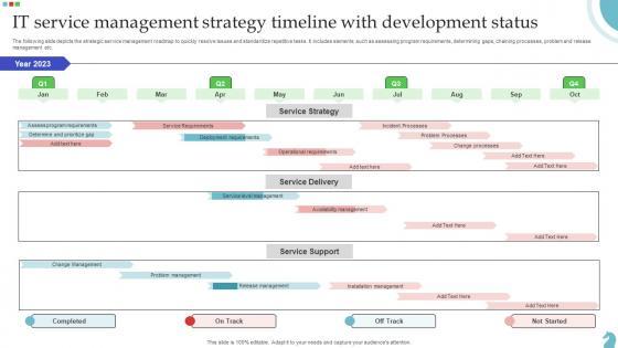 The following slide depicts the strategic service management roadmap to quickly resolve issues and standardize repetitive tasks. It includes elements such as assessing program requirements, determining gaps, chaining processes, problem and release management etc. Pitch your topic with ease and precision using this IT Service Management Strategy Timeline With Development Status Background Pdf. This layout presents information on Strategic Service, Management Roadmap, Standardize Repetitive Tasks. It is also available for immediate download and adjustment. So, changes can be made in the color, design, graphics or any other component to create a unique layout. The following slide depicts the strategic service management roadmap to quickly resolve issues and standardize repetitive tasks. It includes elements such as assessing program requirements, determining gaps, chaining processes, problem and release management etc.