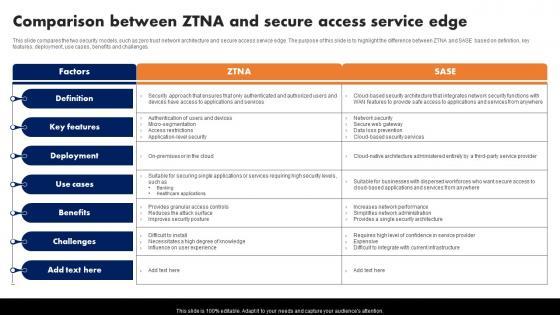 This slide compares the two security models, such as zero trust network architecture and secure access service edge. The purpose of this slide is to highlight the difference between ZTNA and SASE based on definition, key features, deployment, use cases, benefits and challenges. Get a simple yet stunning designed Comparison Between ZTNA And Secure Access Service Edge Zero Trust Network Access. It is the best one to establish the tone in your meetings. It is an excellent way to make your presentations highly effective. So, download this PPT today from Slidegeeks and see the positive impacts. Our easy-to-edit Comparison Between ZTNA And Secure Access Service Edge Zero Trust Network Access can be your go-to option for all upcoming conferences and meetings. So, what are you waiting for Grab this template today. This slide compares the two security models, such as zero trust network architecture and secure access service edge. The purpose of this slide is to highlight the difference between ZTNA and SASE based on definition, key features, deployment, use cases, benefits and challenges.