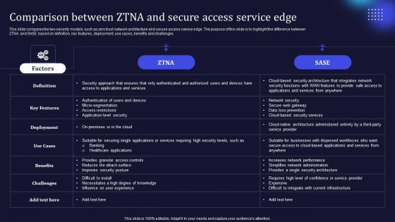 This slide compares the two security models, such as zero trust network architecture and secure access service edge. The purpose of this slide is to highlight the difference between ZTNA and SASE based on definition, key features, deployment, use cases, benefits and challenges. If your project calls for a presentation, then Slidegeeks is your go-to partner because we have professionally designed, easy-to-edit templates that are perfect for any presentation. After downloading, you can easily edit Zero Trust Model Comparison Between ZTNA And Secure Access Service and make the changes accordingly. You can rearrange slides or fill them with different images. Check out all the handy templates This slide compares the two security models, such as zero trust network architecture and secure access service edge. The purpose of this slide is to highlight the difference between ZTNA and SASE based on definition, key features, deployment, use cases, benefits and challenges.