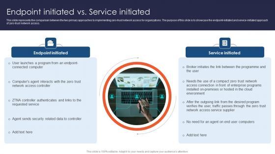 This slide represents the comparison between the two primary approaches to implementing zero-trust network access for organizations. The purpose of this slide is to showcase the endpoint-initiated and service-initiated approach of zero-trust network access. The Zero Trust Network Access Endpoint Initiated Vs Service Initiated is a compilation of the most recent design trends as a series of slides. It is suitable for any subject or industry presentation, containing attractive visuals and photo spots for businesses to clearly express their messages. This template contains a variety of slides for the user to input data, such as structures to contrast two elements, bullet points, and slides for written information. Slidegeeks is prepared to create an impression. This slide represents the comparison between the two primary approaches to implementing zero-trust network access for organizations. The purpose of this slide is to showcase the endpoint-initiated and service-initiated approach of zero-trust network access.