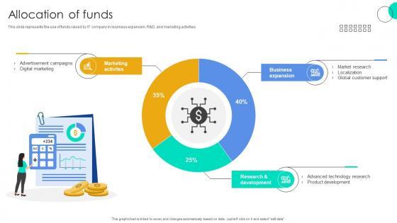 This slide represents the use of funds raised by IT company in business expansion, R and D, and marketing activities. Find a pre-designed and impeccable Allocation Of Funds Function User Interface Service Investor Funding Elevator Pitch Deck. The templates can ace your presentation without additional effort. You can download these easy-to-edit presentation templates to make your presentation stand out from others. So, what are you waiting for Download the template from Slidegeeks today and give a unique touch to your presentation. This slide represents the use of funds raised by IT company in business expansion, R and D, and marketing activities.