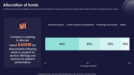 This slide presents stacked bar chart highlights areas where raised funds will be allocated. It includes areas such as business expansion, talent acquisition and development , technology and innovation, and others. Find a pre-designed and impeccable Allocation Of Funds Online Financial Services Platform Ppt Example. The templates can ace your presentation without additional effort. You can download these easy-to-edit presentation templates to make your presentation stand out from others. So, what are you waiting for Download the template from Slidegeeks today and give a unique touch to your presentation. This slide presents stacked bar chart highlights areas where raised funds will be allocated. It includes areas such as business expansion, talent acquisition and development , technology and innovation, and others.
