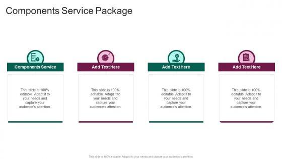Introducing our well designed Components Service Package In Powerpoint And Google Slides Cpb. This PowerPoint design presents information on topics like Components Service Package. As it is predesigned it helps boost your confidence level. It also makes you a better presenter because of its high quality content and graphics. This PPT layout can be downloaded and used in different formats like PDF, PNG, and JPG. Not only this, it is available in both Standard Screen and Widescreen aspect ratios for your convenience. Therefore, click on the download button now to persuade and impress your audience. Our Components Service Package In Powerpoint And Google Slides Cpb are topically designed to provide an attractive backdrop to any subject. Use them to look like a presentation pro.