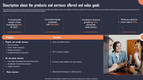 This slide provides a gist of products and services which the business will offer along with the revenue assumptions for the future growth of the business. What are the parameters which the business will set for increased sales and different food products and services which the business will be offering. From laying roadmaps to briefing everything in detail, our templates are perfect for you. You can set the stage with your presentation slides. All you have to do is download these easy-to-edit and customizable templates. Description About The Products And Services Offered And Sales Goals Assurant Insurance Agency Brochure Pdf will help you deliver an outstanding performance that everyone would remember and praise you for. Do download this presentation today. This slide provides a gist of products and services which the business will offer along with the revenue assumptions for the future growth of the business. What are the parameters which the business will set for increased sales and different food products and services which the business will be offering.