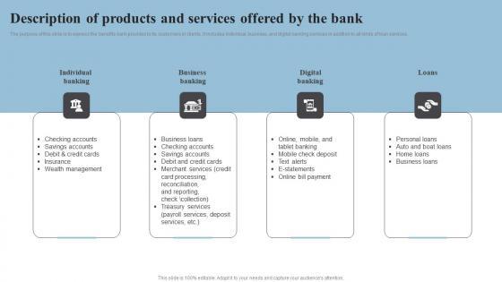The purpose of this slide is to express the benefits bank provides to its customers or clients. It includes individual, business, and digital banking services in addition to all kinds of loan services. Slidegeeks is here to make your presentations a breeze with Description Of Products And Services Banking Start Up B Plan Go To Market Strategy Template Pdf With our easy to use and customizable templates, you can focus on delivering your ideas rather than worrying about formatting. With a variety of designs to choose from, you are sure to find one that suits your needs. And with animations and unique photos, illustrations, and fonts, you can make your presentation pop. So whether you are giving a sales pitch or presenting to the board, make sure to check out Slidegeeks first The purpose of this slide is to express the benefits bank provides to its customers or clients. It includes individual, business, and digital banking services in addition to all kinds of loan services.